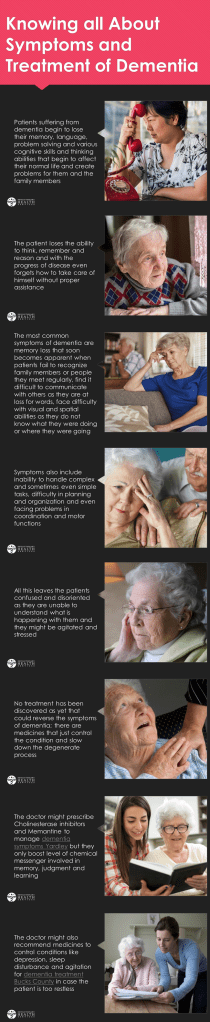 Dementia is a collection of symptoms caused by disorder affecting the brain tissues. As brain is the part of the body that controls everything, dementia results in a series of symptoms. Most common symptoms observed in a patient of dementia are described below. It can affect how you think, behave and/or carryout everyday tasks. It affects the functioning ability of the brain in a way that one finds it hard to memorize or remember a thing; minor stuff like buttoning up the shirt become a serious hassle.